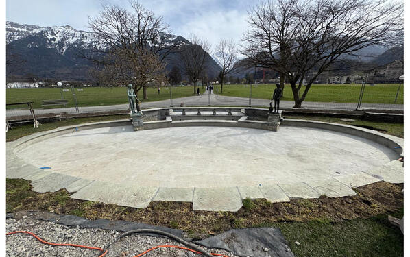 Die Gemeinde Interlaken initiierte daher 2023/24 die umfassende Projektierung einer Sanierung; diese umfasste neben dem Substanzerhalt des Betonteils auch die komplette Erneuerung der Wassertechnik und der Entwässerung. Zudem wurde Wert auf die denkmalpflegerische Sicherung der historischen Bronzestatuen gelegt.