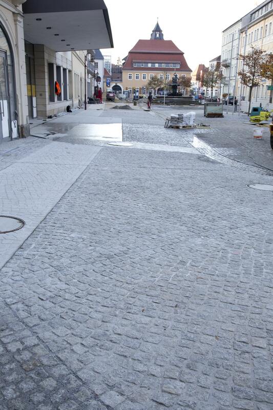 Kaum ein Ort in Sachsen ist so häufig vom Hochwasser betroffen wie Bad Schandau. Nach dem Jahrtausendhochwasser im Sommer 2002 trat die Elbe, die mitten durch den Ort fließt, in den Folgejahren drei weitere Male über die Ufer. In 2013 verursachte das Hochwasser erneut erhebliche Schäden, unter anderem war auch der Marktplatz betroffen. Für die Sanierung des Pflastersteinbelags galt: Eine absolut sichere Verlegung und Verfugung sollte den Marktplatz zukünftig vor Hochwasserschäden bewahren. Zudem musste bei der Planung und Durchführung die Umgestaltung des Platzes berücksichtigt werden. Eine Busschleife und etliche Pflanzkübel aus Granit sollten integriert werden.
