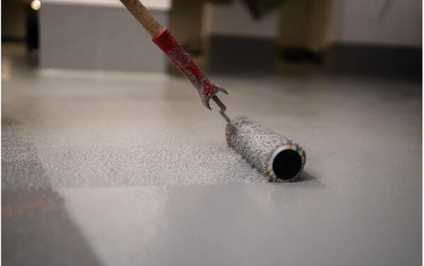 Als 2K-Epoxi-Deckschicht verwendeten die Verarbeiter PCI Apoten OS TC im System. Um ein homogenes Oberflächenbild zu erhalten, brachten sie das Material zunächst durch Fluten auf, verteilten es dann mit einem Gummischieber und verschlichteten es anschließend durch Rollen im Kreuzgang. Wie die verwendete 2K-Epoxi-Grundierung ist auch die Deckschicht niedrigviskos und lösemittelfrei nach TRGS 610. Das System, bestehend aus der 2K-Epoxi-Grundierung und der Deckversiegelung, ist klassifiziert nach DIN EN 13813 und EN 1504-2. Anschließend bearbeiteten die Verarbeiter alle vorhandenen Anschluss- und Bewegungsfugen. Diese spritzten die Verarbeiter mit dem einkomponentigen Polyurethan-Dichtstoff PCI Elritan 140 mit einer geeigneten Ausspritzpistole aus. Anschließend glätteten sie die Oberfläche mit PCI-Glättmittel. Vorausgegangen waren die notwendigen Vorarbeiten: Vorreinigung der Fugenflanken, Hinterfüllen mit DIN-Polyband, Abkleben der Flanken und Aufbringen der Haftgrundierung PCI Elastoprimer 110.