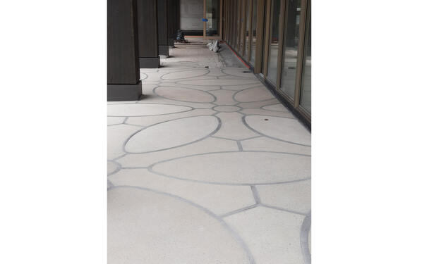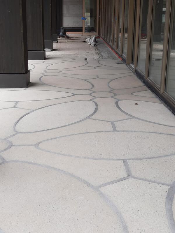 Die Kunsteinplatten wurden im gleichen Arbeitsablauf wie der Splittbeton verlegt. Dabei ist der Splittbeton schrittweise auf die benötigte Höhe abgezogen und die Rückseite der Kunststeinplatten, versehen mit einer Haftbrücke bzw. Plattenkleber, in den noch frischen Splittbeton eingeklopft worden.