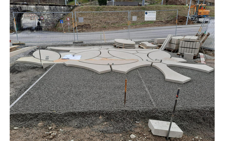 Im Aussenbereich Kunststeinplatten in Form einer Blume, mit trasshaltigen Zement-Pflasterfugenmörtel ausfugen.
