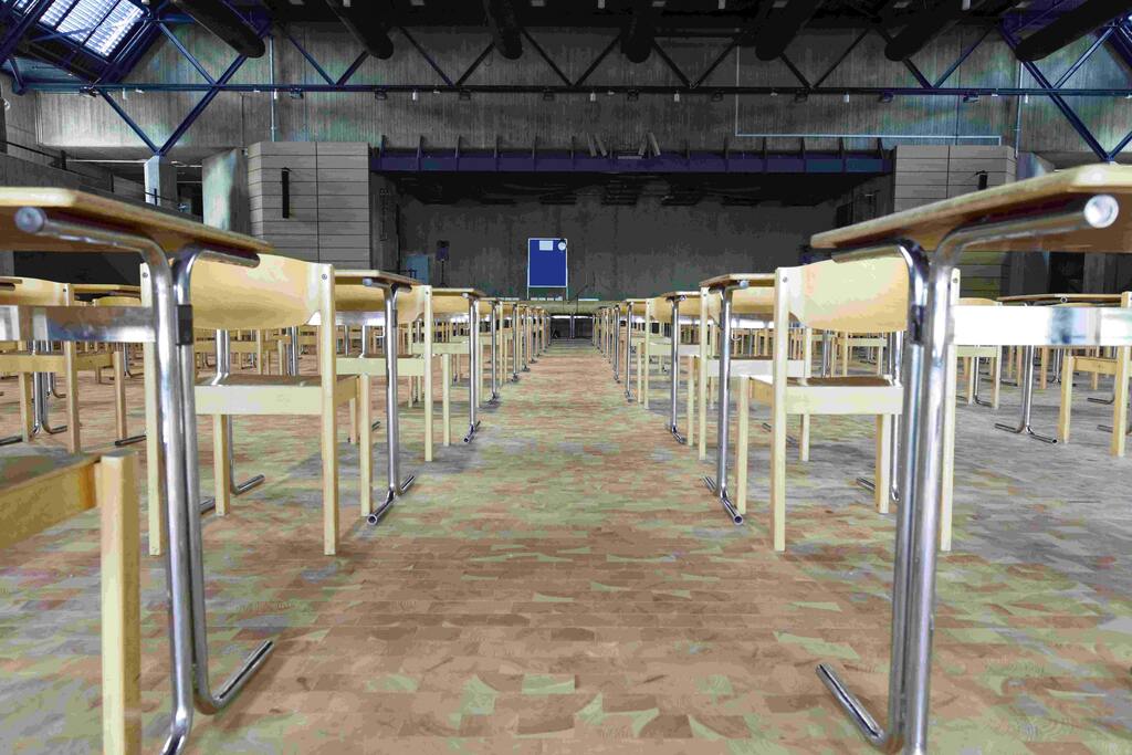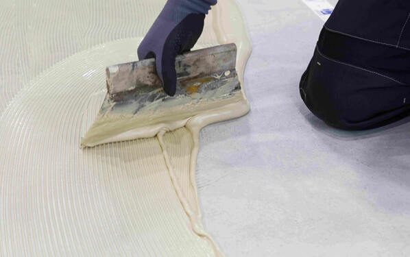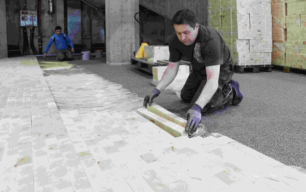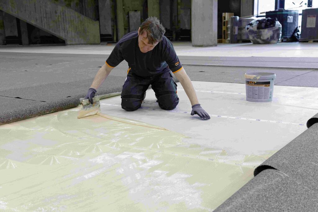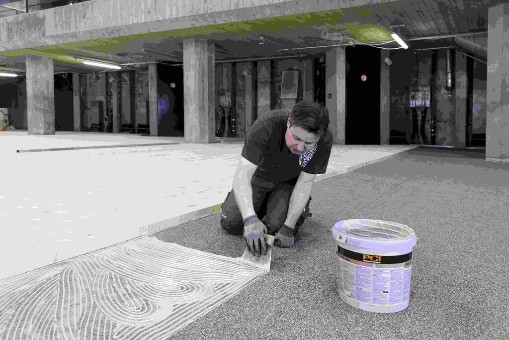 Zur Egalisierung des Bodens beförderten die Handwerker innerhalb von zwei Tagen 20 Tonnen Universal-Spachtelmasse PCI USP 32 in maximaler Schichtdicke von 20 mm auf den Boden der Aula. Die Ausgleichsmasse ist leicht verlaufend, schleifbar, staub- und spannungsarm. Zum Entlüften verwendeten die Handwerker eine Stachelwalze. Um Schallbrücken zu vermeiden und den erforderlichen Bewegungsspielraum im Rahmen des Systemaufbaus zu gewährleisten, wurde zuvor der selbstklebende Randdämmstreifen PCI Pecitape Silent für den Boden-Wand-Anschluss angebracht. Auf der gehärteten und tragfähigen Spachtelmasse verklebten die Handwerker die Dämmunterlage PCI DU 903 FH mit dem lösemittelfreien SMP-Parkettkleber PCI PAR 365.