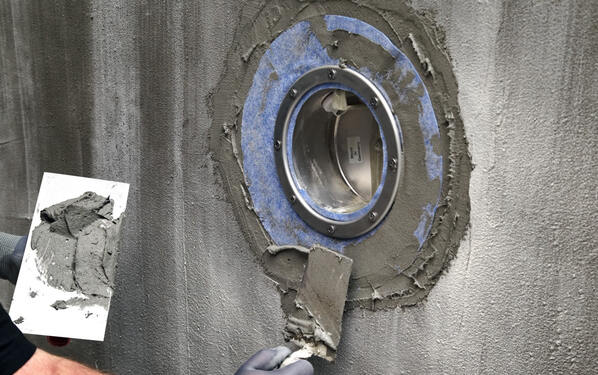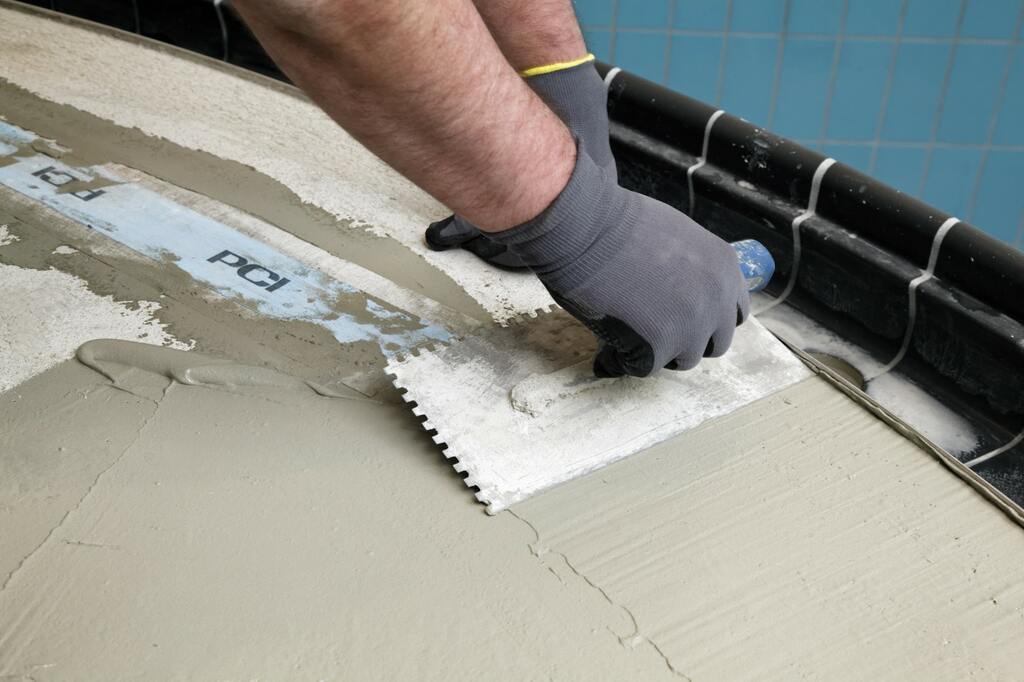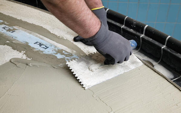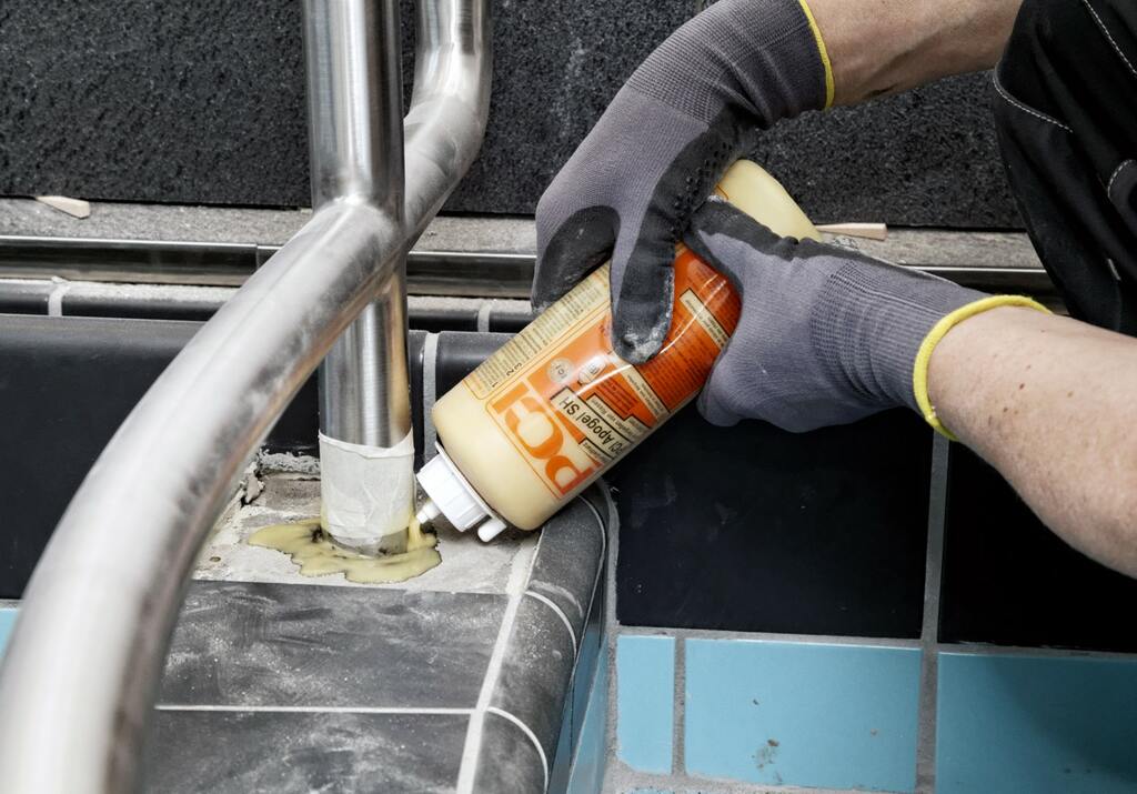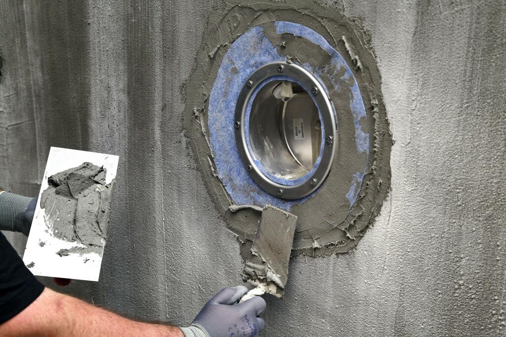 Eine besondere Herausforderung stellte sich bei der Abdichtung des Poolbeckens. Der Beckenkörper war aus wasserundurchlässigem Beton gegossen und sollte zusätzlich mit der Verbundabdichtung aus PCI Seccoral versehen werden. Allerdings fehlten an den bereits eingebauten Montagetöpfen für die Poolleuchten und an den Einströmdüsen ausreichend breite Flansche, an denen nach Grundierung mit einer Epoxidharzgrundierung und Absandung die Flächenabdichtung des Beckens angeschlossen werden konnte. Auf Empfehlung des PCI-Anwendungstechnikers Hans-Peter Schmied setzen die Handwerker eine Kombination aus Dichtring-Manschette-Dichtring-Klemm-Flansch ein, um die Anbindung absolut sicher und dauerhaft zu realisieren. Der Flansch wurde abschließende mit PCI Seccoral 2K Rapid überarbeitet und der Bereich mit dem Ausgleichsmörtel PCI Pericret beigespachtelt, um eine planebene Fläche zu erzielen. Für die Abdichtung, Verlegung und Verfugung im Spa-Bereich kamen die hochwertigen und gut aufeinander abgestimmten Produkte des Systems „Schwimmbad“ zum Einsatz. Bei den Abdichtungsarbeiten mit der PCI Sicherheits-Dichtschlämme PCI Seccoral 2K Rapid wurde das Spezial-Dichtband PCI Pecitape im Eck- und Boden/Wand-Anschlussbereich verarbeitet. Das Setzen des Beckenkopfes führte das Fliesenlegerteam mit dem Epoxidharz-Bindemittel PCI Durapox NT, abgemischt mit Quarzsand, aus. Um eine kapillarbrechende Bettungsschicht zu erzielen, wurden die Beckenkopfsteine hohlraumfrei auf den Reaktionsharzmörtel gesetzt. Als zusätzliche Kapillarsperre wurde die umlaufende Fuge mit PCI Apoten, 1:1 verschnitten mit Quarzsand, vergossen.