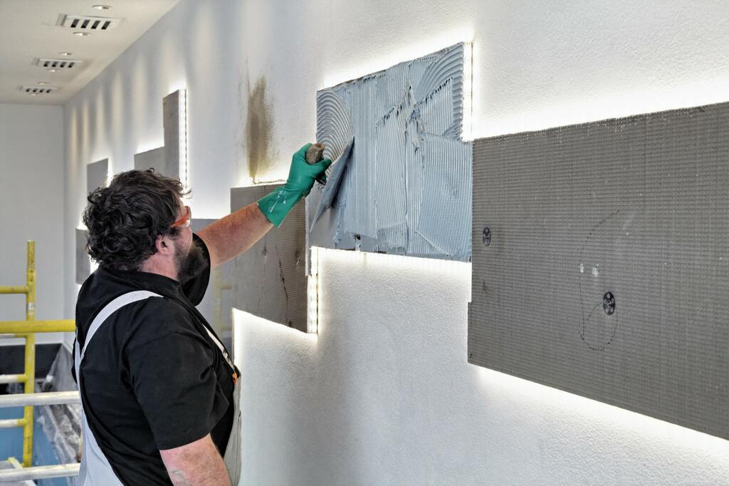 Ein besonderes Highlight im Spa-Bereich der Oberstdorfer Residenz ist das Lichtkonzept: Farbiges LED-Licht, das im ganzen Bereich einheitlich wechselt, verbindet die unterschiedlichen Räume. Das Lichtobjekt im Schwimmbad sollte mit großformatigen Fliesen verkleidet werden. Als Träger dienten mit LED-Technik versehene Multiplexplatten, die an der Wand befestigt waren. Nach Rücksprache mit PCI-Anwendungstechniker Hans-Peter Schmied entschied man sich für den zweikomponentigen Polyurethankleber PCI Collastic, der als Kontaktschicht auf die Rückseiten der Feinsteinzeugplatten aufgezogen und auf die Multiplexplatten aufgekämmt wurde. Mit PCI Collastic erfolgte anschließend das Verlegen „frisch in frisch“.