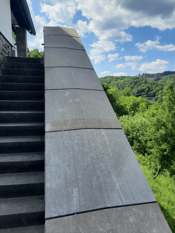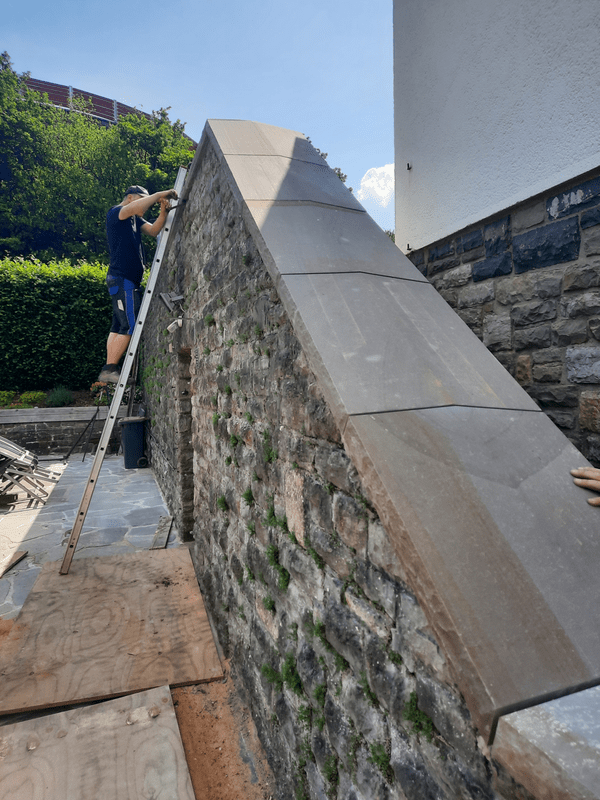 Inmitten der malerischen Kulisse der Nordeifel erhebt sich die eindrucksvolle Urfttalsperre, ein imposantes Bauwerk von historischer Bedeutung. Die Staumauer, die zwischen 1900 und 1905 errichtet wurde, erstreckt sich über 226 Meter und ragt 58,5 Meter in die Höhe. Ihre Hauptaufgabe besteht darin, die Urft aufzustauen und den Urftstausee zu formen. Im Zuge einer notwendigen Baumaßnahme wurden hier – in einem privat genutzten, öffentlich nicht zugänglichen Bereich – insgesamt 53 Meter Mauerabdeckungen aus robustem Grauwacke-Naturstein neu verlegt. Jede einzelne dieser Abdeckungen ist eine Sonderanfertigung und wiegt beachtliche 60 Kilogramm. Derartig massive Platten mit einer Stärke von 7 bis 10 cm dienen als Witterungsschutz der hinterlüfteten Außenverkleidung. Die Herausforderung der Erneuerung lag darin, den Untergrund, der aus einer Kombination von Beton, Bruchsteinmauerwerk und reinem Bruchstein bestand, angemessen vorzubereiten, um die Mauerabdeckungen sicher und dauerhaft zu installieren.