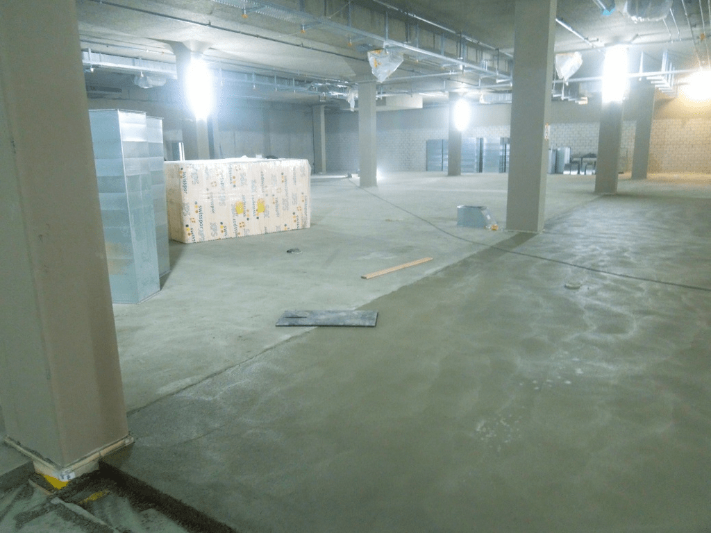 Rund 80 Tonnen Baustellenmischung mit PCI Novoment Z3 verarbeitete die beauftragte Tino Bodenbeläge AG aus Domat / Ems für den Einbau des schwimmenden Überzugs. Anschließend musste die Belastbarkeit schnell abgeklärt werden, denn die Deckeninstallation hatte mittels schwerer Hebebühnen zeitnah zu erfolgen. Aus diesem Grund führte ein unabhängiges Prüflabor Festigkeitsprüfungen durch: Gemäß den Normvorgaben müssen Werte des Überzuges mit Klassifizierung CT-C40-F8 (CT: Zementös, C: Druckfestigkeit; F: Biegezugfestigkeit in N/mm2) in der Bestätigungsprüfung vor Ort eine Biegezugfestigkeit von 4 N/mm2 aufweisen. Dies entspricht einer Abminderung der klassifizierten Biegezugfestigkeit um den Sicherheitsfaktor zwei. Neben vielen anderen Aspekten berücksichtigt dieser Faktor vor allem den Einbau, der auf der Baustelle nie so perfekt wie in unter Laborbedingungen erfolgen kann. Die genannten Festigkeitswerte gelten für die 28-Tage-Werte. Der Unterlagsboden sollte aber nach wenigen Tagen hoch belastbar sein.