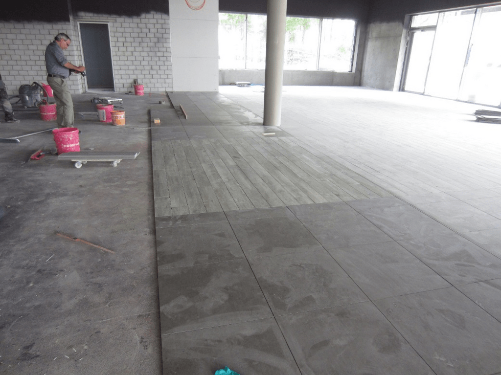 Einbau von Unterlagsboden und Verlegung von Feinsteinzeugplatten nach drei Tagen