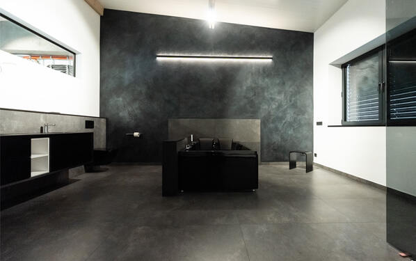 Auch bei der Fliesenverlegung in den Bädern hatte der Bauherr eine genaue Vorstellung: Hier stand die Fuge im Fokus. Eine widerstandsfähige Fuge, die farblich genau zum Fliesenbelag passt, war der Wunsch. Damit ergab sich der Systemaufbau: Die Abdichtung erfolgte mit der Dichtbahn und dem Dichtband von PCI, inklusive Ecken und Manschetten. „Diese Produkte bieten ein optimales Preis-Leistungsverhältnis. Für die Verlegung des großformatigen keramischen Oberbelags verwendeten wir PCI FT Flex und PCI Flexmörtel S1 Flott. Beide Fliesenkleber bieten hohe Standfestigkeit auch bei schweren Platten", erläutert Alex Jess. Um den Wunsch nach einer strapazierfähigen Fuge mit vielfältiger Farbauswahl zu erfüllen, verwendeten die Handwerker PCI Durapox Premium. Der Epoxidharzfugenmörtel mit sehr geschmeidigem Einfugverhalten ist chemikalienbeständig und hat – passend zum exklusiven Fliesenbelag in den Bädern – eine farbbrillante, sehr homogene Fugenoberfläche. Auch dem Aspekt "Wohngesundes Bauen" wurde mit den PCI-Produkten Rechnung getragen: Der Sichtbeton PCI Zemtec 1K sowie die verwendeten Fliesen- und Fugenmörtel sind sehr emissionsarm nach GEV-EMICODE EC1 PLUS.